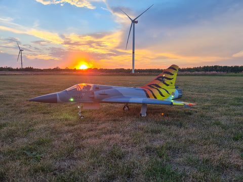 The Dassault Mirage 2000 is a French multirole, single-engine fourth-generation jet fighter manufactured by Dassault Aviation. It was designed in the late 1970s as a lightweight fighter based on the Mirage III for the French Air Force (Arme de l'Air). The Mirage 2000 evolved into a multirole aircraft with several variants developed, with sales to a number of nations. The variants include the Mirage 2000N and 2000D strike variants, the improved Mirage 2000-5 and several export variants. Over 600 aircraft were built and it has been in service with nine nations. We are proud to offer the Mirage 2000 as our latest model in the 9 blade 80mm EDF offering. As you've come to expect from Freewing Model, the Mirage 2000 is loaded with scale features and performance componentry. The new 80mm 9-blade EDF with metal housing powered by a powerful 1900kV motor produces nearly 6 pounds of thrust for awesome speed and incredible maneuverability. The sound produced from the 9 blade EDF will simply blow you away. While 5 and 6 blade EDF produce a high pitched whining sound, the 9 blade EDF with metal housing produces the "whoosh" and air crushing sound similar to a gas turbine jet. Additional upgraded features include a 100A Hobbywing ESC, 9g precision servos, and electronic retracts with full metal shock absorbing struts. Own the latest, highly detailed, best built RC foam jet on the market from Freewing - the Mirage 2000.